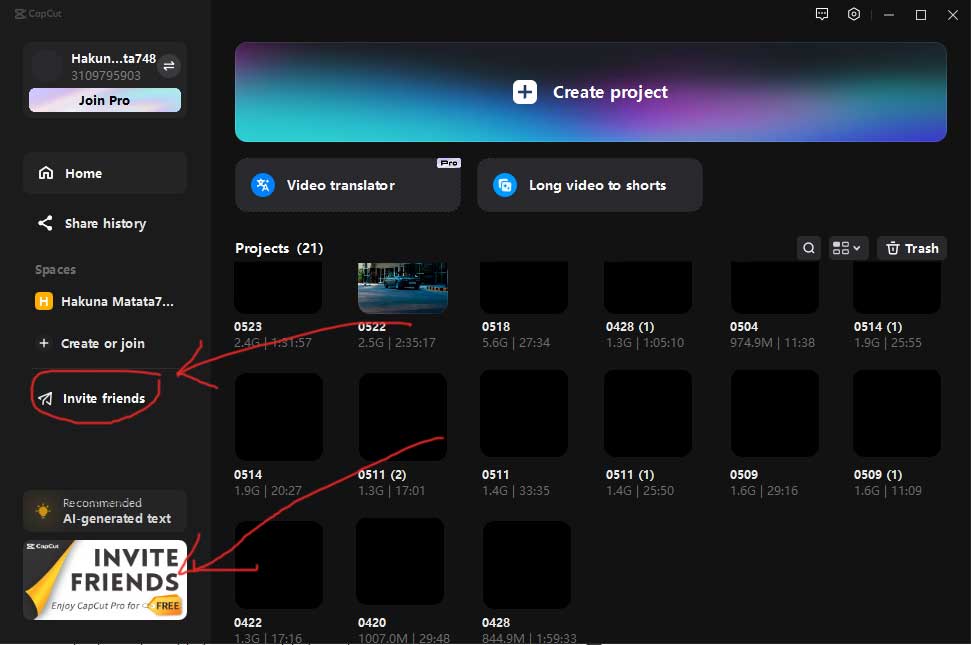 Buka aplikasi CapCut di ponsel atau PC-mu dan cari menu “Ajak Teman” (atau “Invite Friends”). Melalui menu ini, kamu bisa mendapatkan tautan undangan. Bagikan tautan ini ke teman-temanmu.
